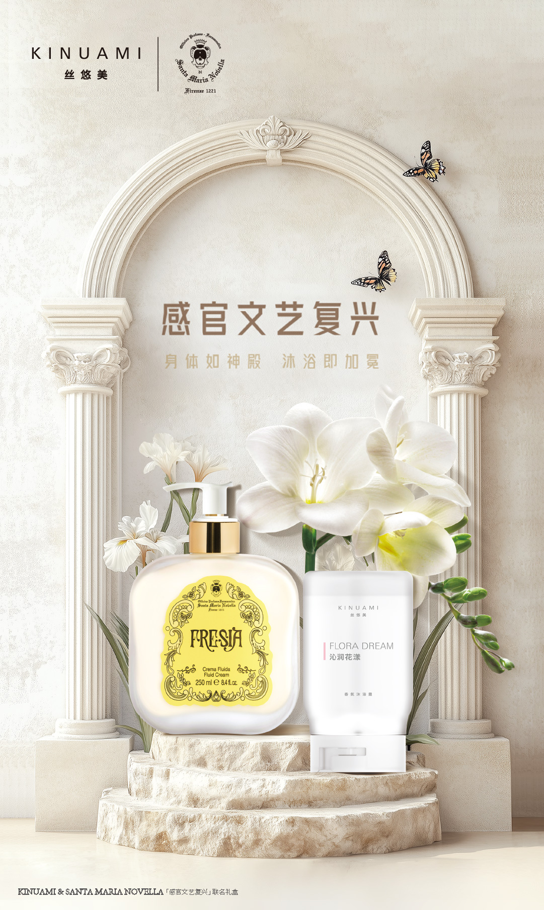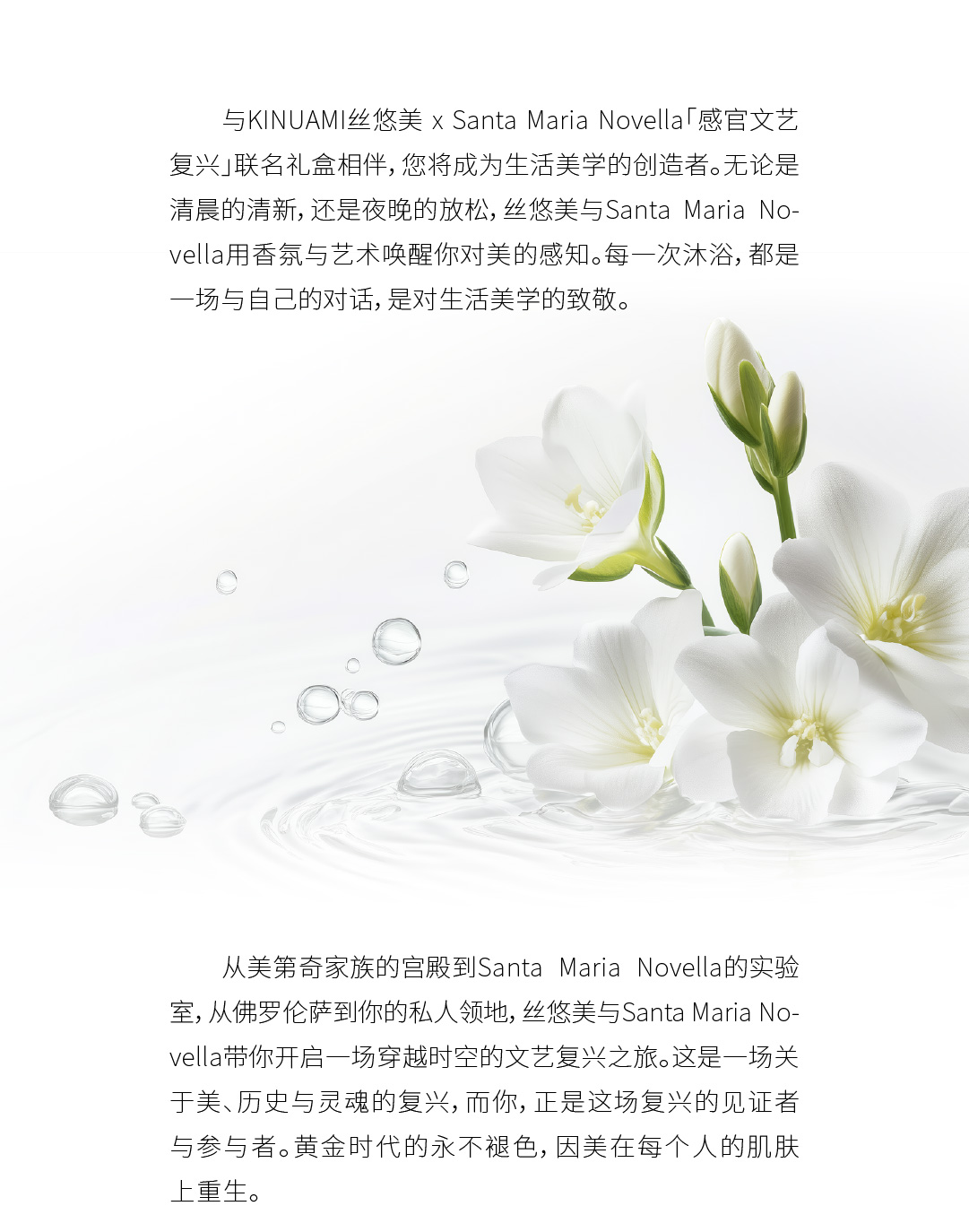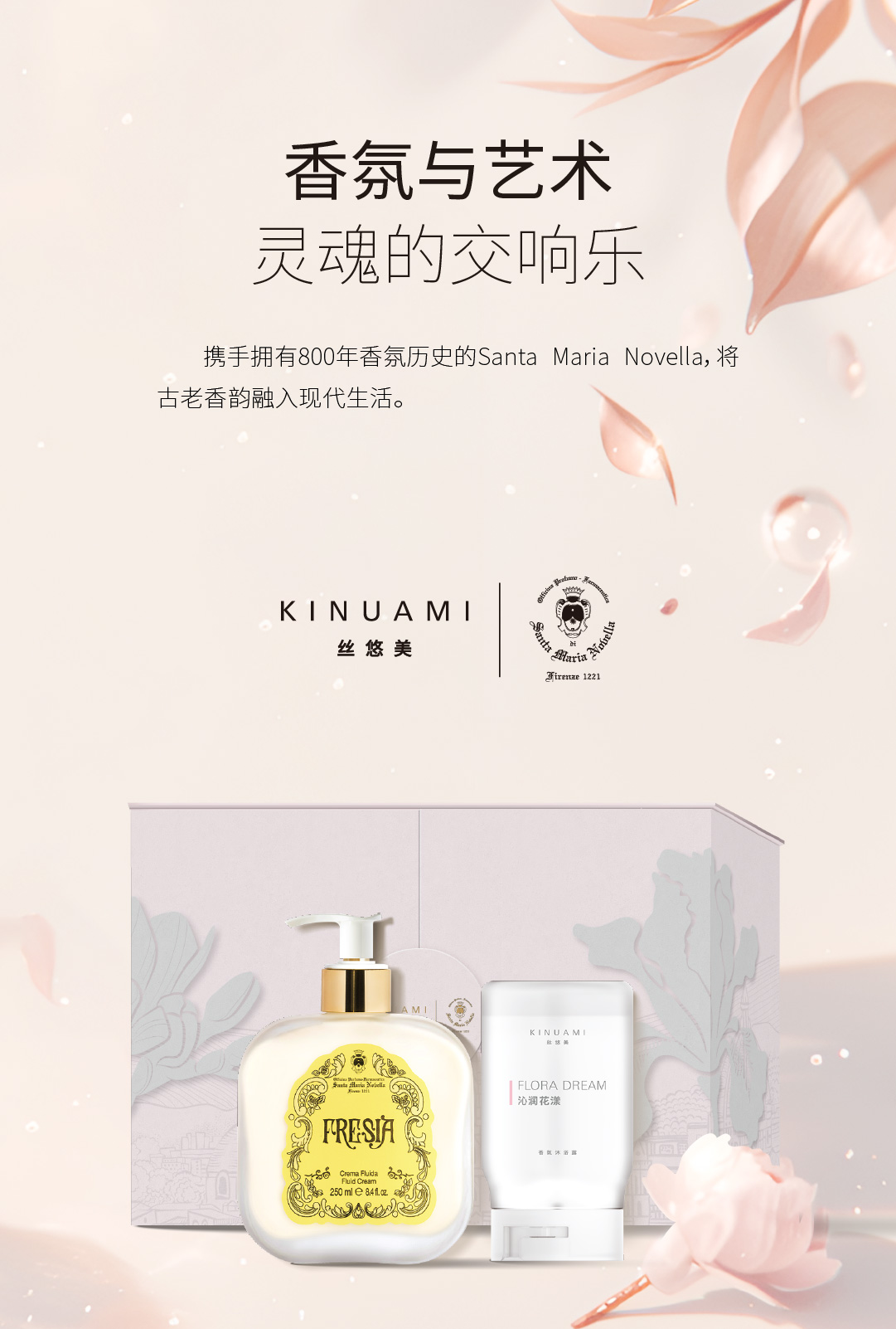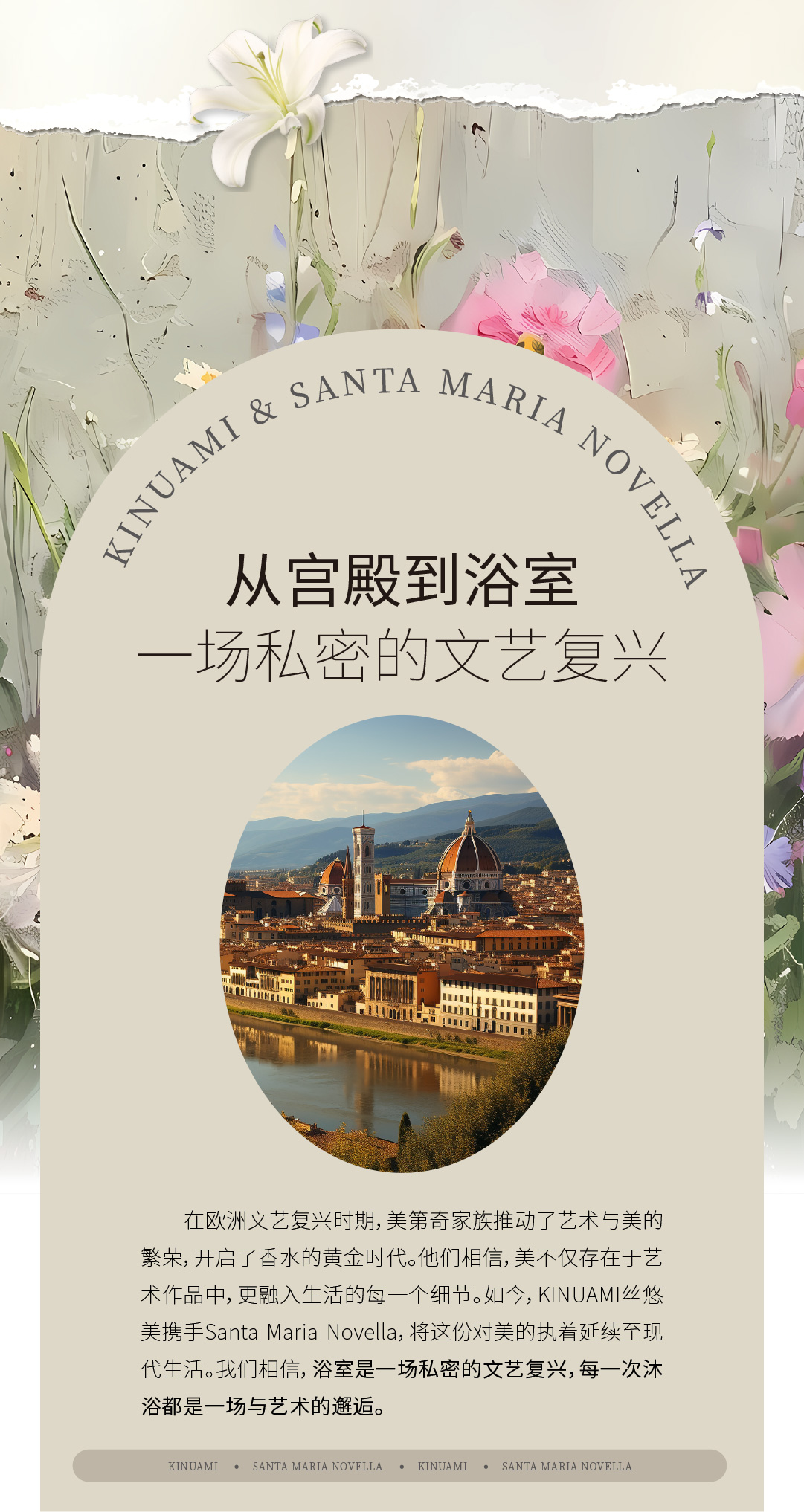 在欧洲文艺复兴时期,美第奇家族推动了艺术与美的繁荣,开启了香水的黄金时代。他们相信,美不仅存在于艺术作品中,更融入生活的每一个细节。如今,KINUAMI丝悠美携手Santa Maria Novella,将这份对美的执着延续至现代生活。我们相信,浴室是一场私密的文艺复兴,每一次沐浴都是一场与艺术的邂逅。