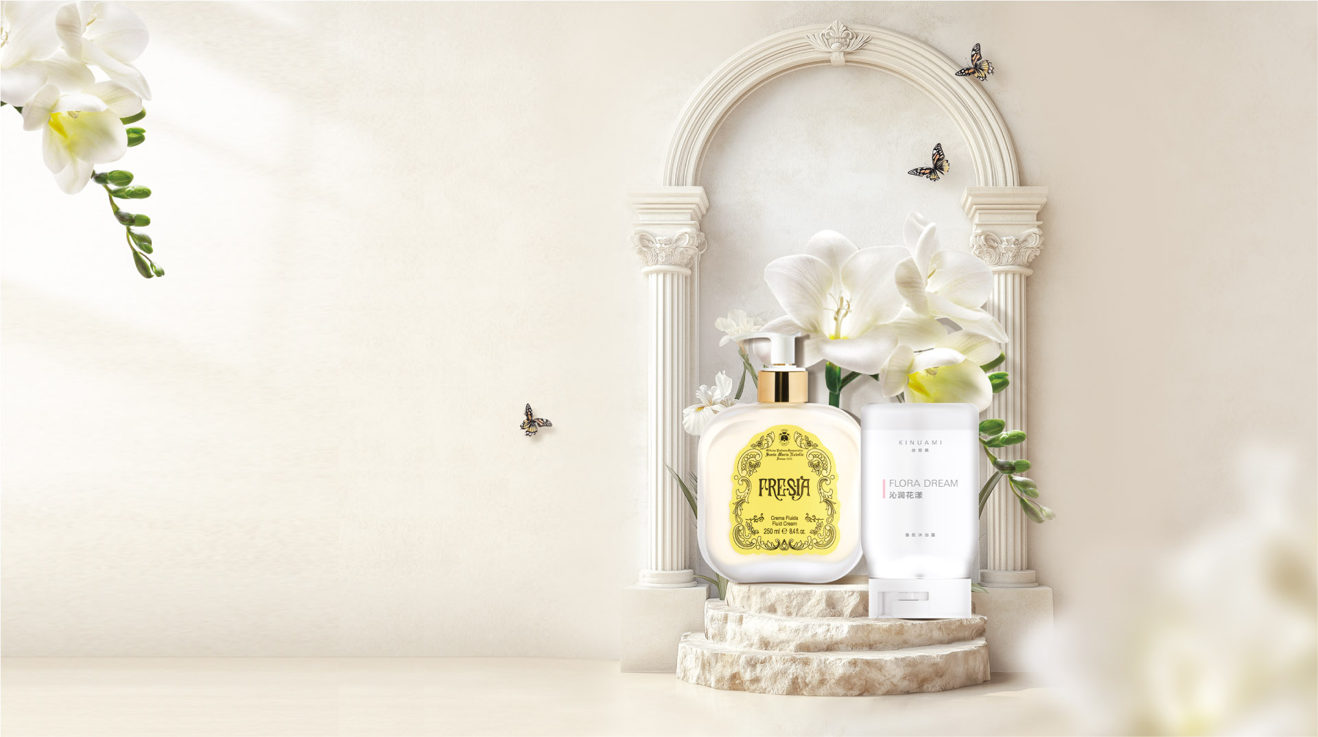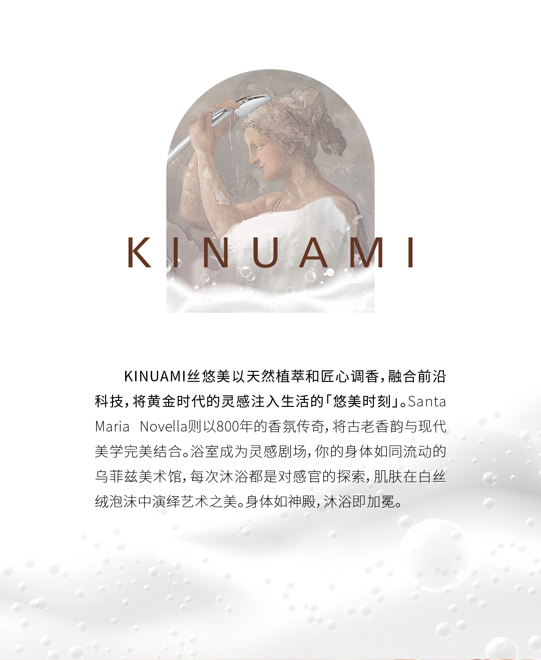 KINUAMI丝悠美以天然植萃和匠心调香,融合前沿科技,将黄金时代的灵感注入生活的「悠美时刻」。Santa Maria Novella则以800年的香氛传奇,将古老香韵与现代美学完美结合。浴室成为灵感剧场,你的身体如同流动的乌菲兹美术馆,每次沐浴都是对感官的探索,肌肤在白丝绒泡沫中演绎艺术之美。身体如神殿,沐浴即加冕。